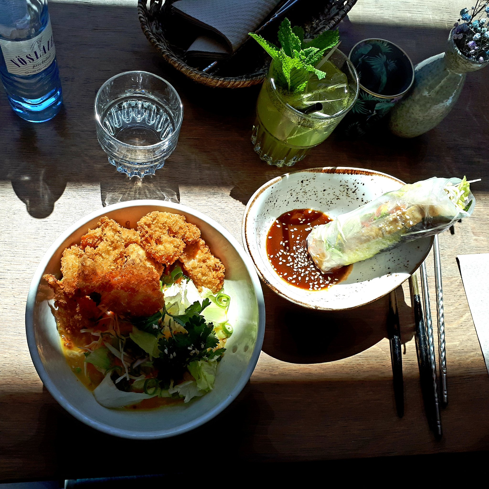 Meanwhile, this was my lunch on Tuesday: Vietnamese summer roll and a rice noddle bowl with tempura shrimp and spicy mango sauce.