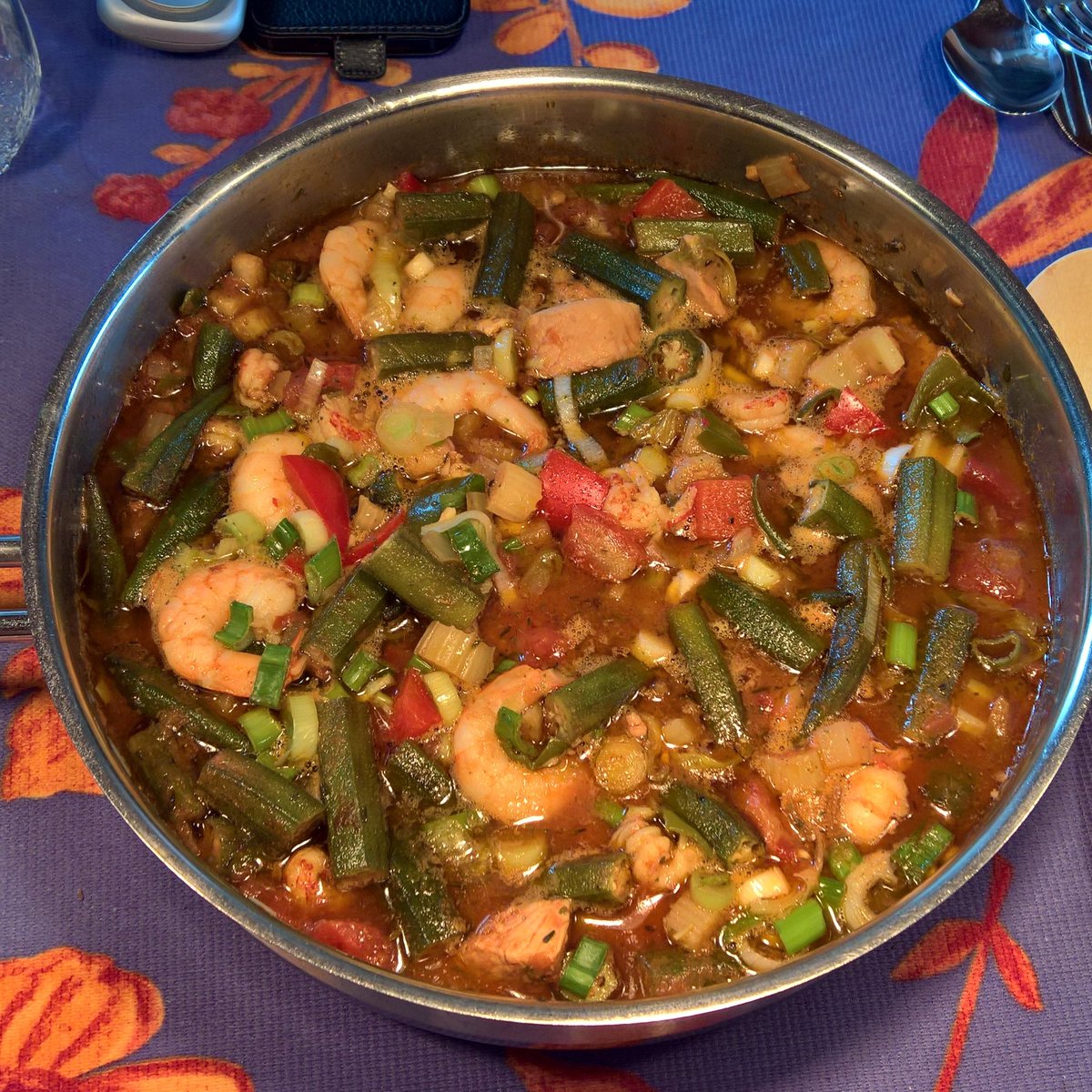 I got lucky and snagged some okras at the Asian grocery and made gumbo with turkey, shrimps and crawfish: