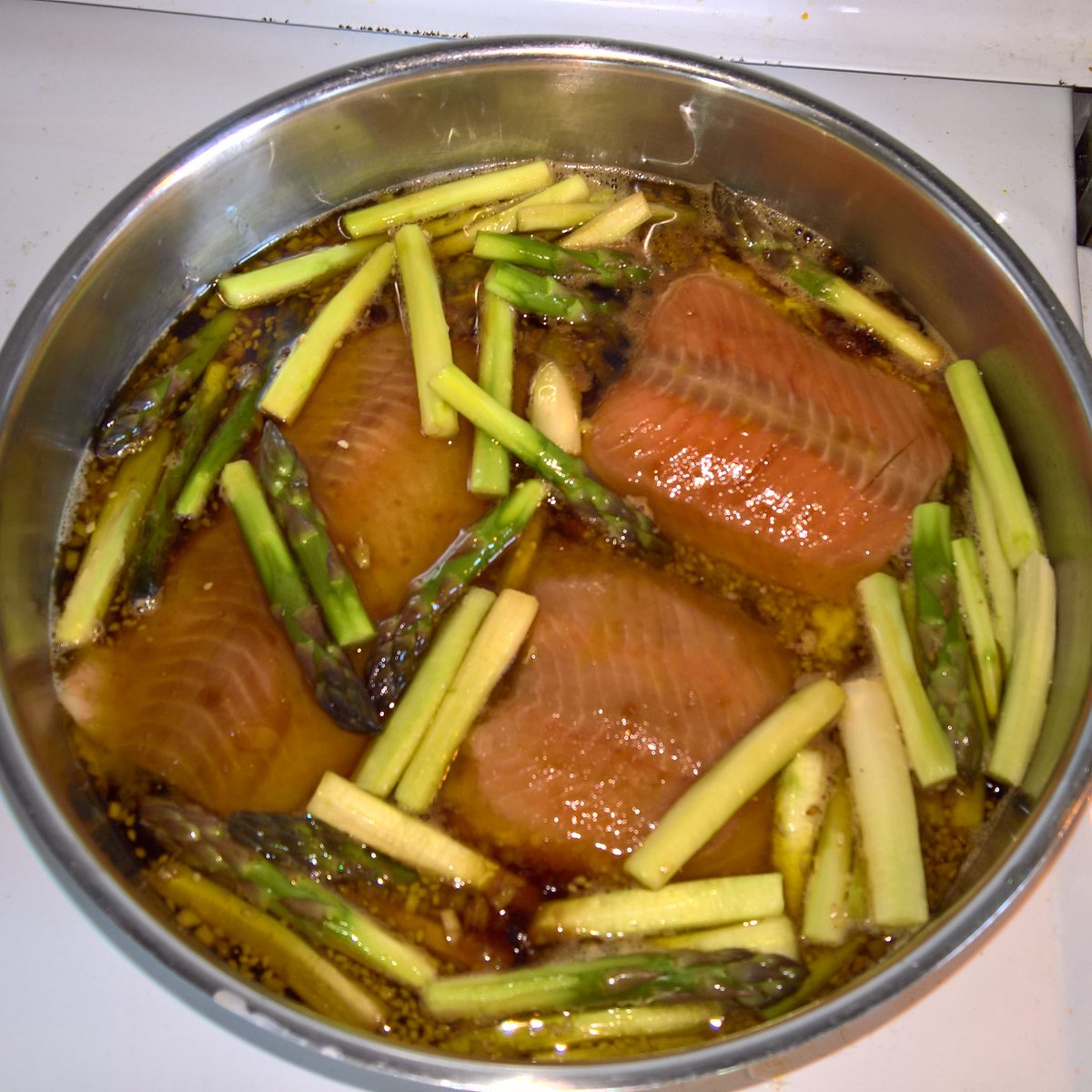 Meanwhile, here is today's lunch, salmon teriyaki with asparagus, cooking: