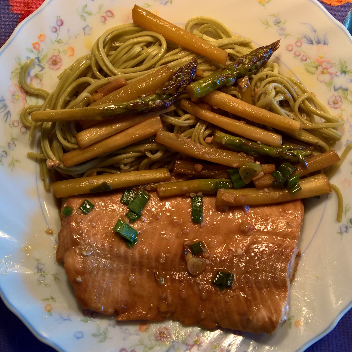 And here is the salmon teriyaki on the plate, served with green tea soba noodles and the above mentioned asparagus: