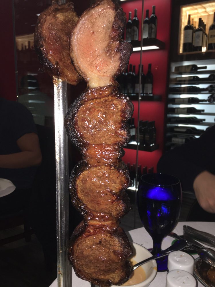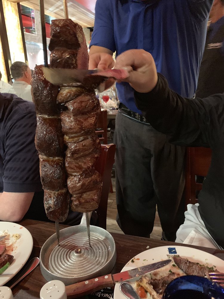 Had lunch at Texas de Brazil (a churrascaria) in Irvine a couple days ago. Servers bring meat on skewers to your table and carve whatever you want.