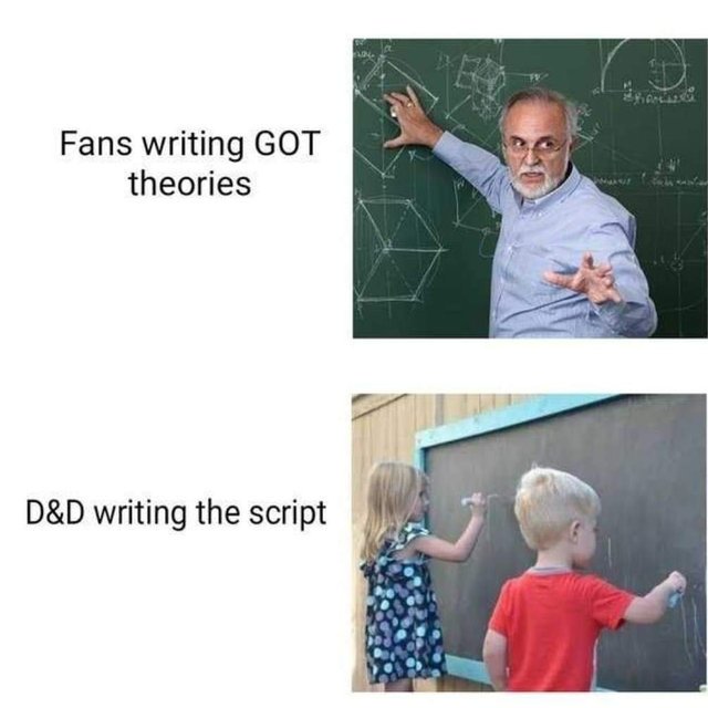 The showrunners decided to jettison from the book material back when there was still plenty of book material to use. That's on them and that decision is what's led to the crappy ending. Again, even if all they had was an outline from GRRM right from the start, they're writers - it's what they're being paid big money to do. I don't place any of the blame for the show's terrible writing on GRRM. He gave them his notes, the highly paid professional writers should be more than able to take it from there. That there wasn't strict book material there for them to use or George himself there to hold their hands should not absolve their terrible writing.